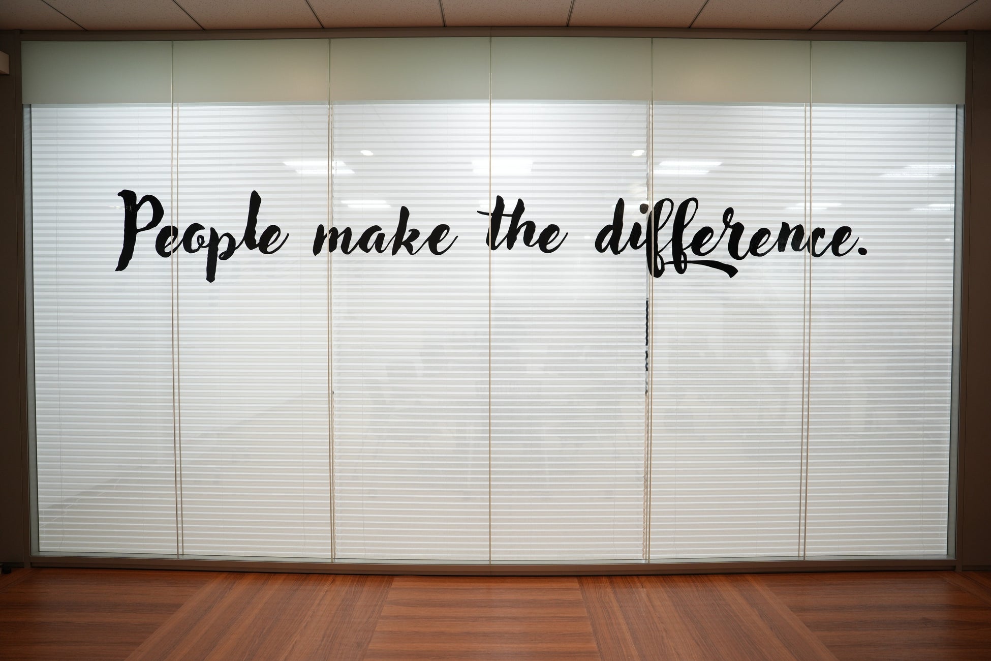 エントランスを抜けると、まず、LVMHの理念「人々が違いを生む(People make the difference)」というメッセージが目に飛び込んできます。手書きの文字は温もりを感じさせます。また、カラーフィルムで彩られた壁面は、人の後頭部を表しており、それぞれ違うヘアスタイル、カラー、装飾品、メガネがあしらわれ、多様性を表現。イベントや研修などでLVMH Houseを訪れる人々が、LVMHという存在を鑑賞するように知り、成長してほしいという想いが込められています。