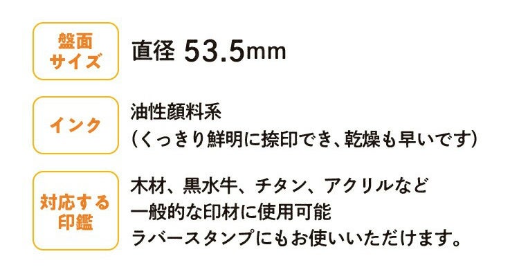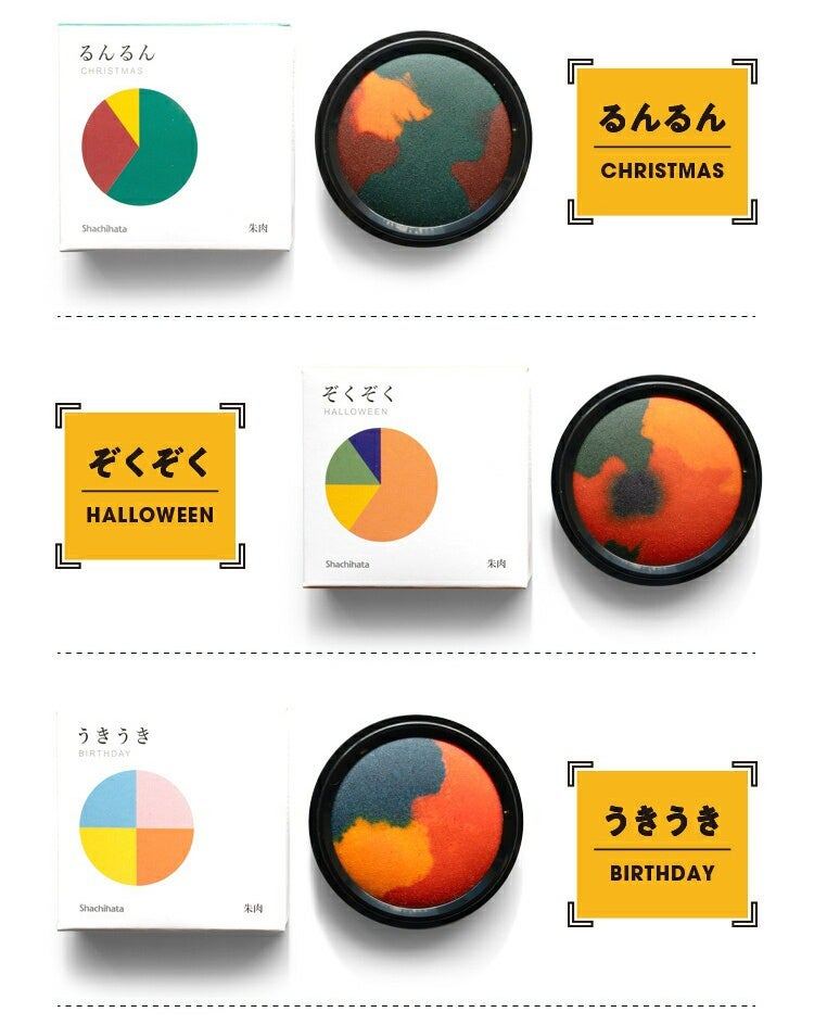 今回私たちのネットショップで発売されたのは、それぞれグラデーションの異なる「るんるん」「ぞくぞく」「うきうき」の3種類(実際の色味は以下画像を参照)。盤面サイズは直径53.5mm、油性顔料系インクを採用し、木彫り(柘植)や黒水牛、チタン、アクリル印材などの印鑑はもちろん、ラバースタンプなど幅広いスタンプに使用できます。私たちのオンラインショップでは、キャラクター印鑑やデザインはんこと組み合わせた使用シーンを中心に紹介し、商品そのものの魅力とともに楽しみ方を提案しています。