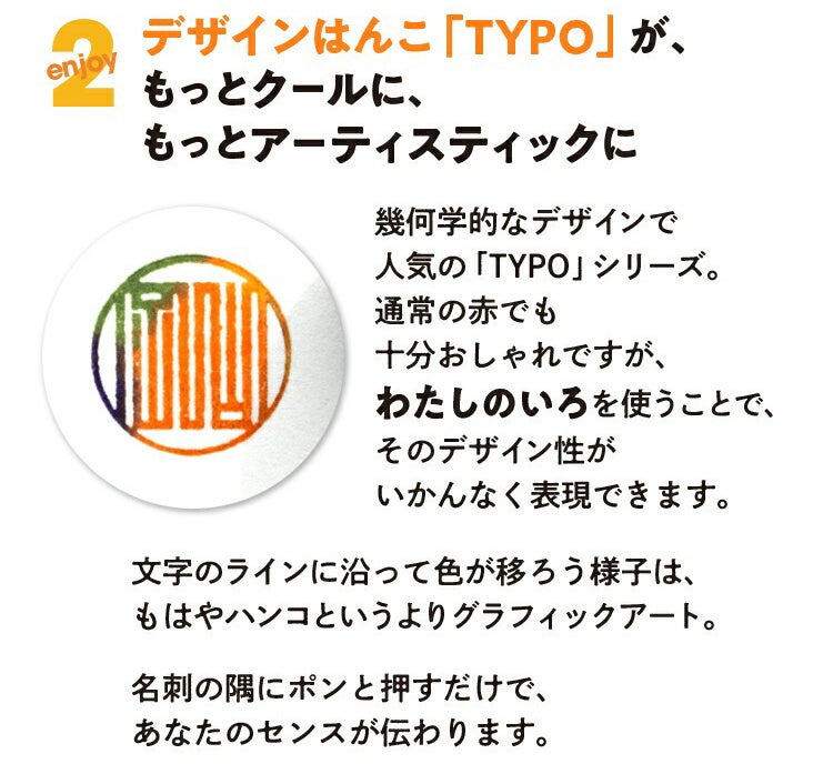 幾何学的なデザインが特徴のタイポグラフィーはんこ「TYPO」シリーズにおいても、「わたしのいろ」は新たな魅力を引き出します。文字のラインに沿って色が移ろう印影は、スタンプというよりグラフィックアートに近く、名刺やカードの片隅に押すだけで、その人の感性や価値観が伝わります。