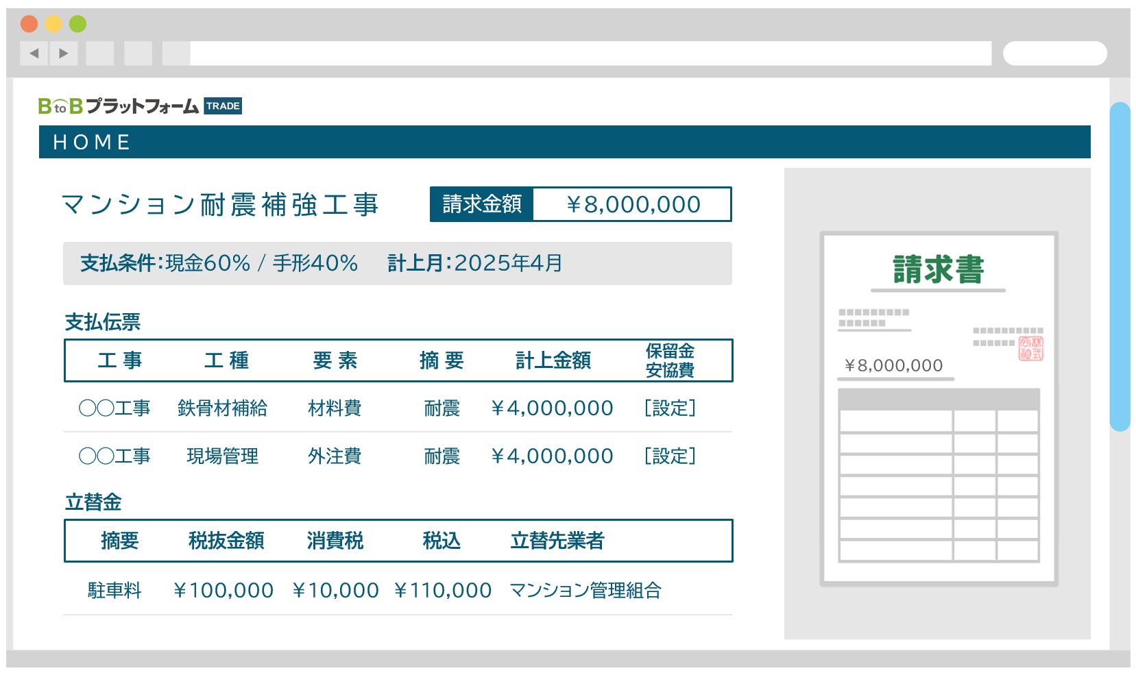 この度、2025年1月に一部の「BtoBプラットフォーム TRADE」ユーザーに向けてテスト環境の提供を開始した(※1)、建設業向けの「請求書機能」を正式にリリースしました。先行してご利用いただいたユーザーからは、特に操作性の高さや充実した機能性について、高い評価をいただいています。