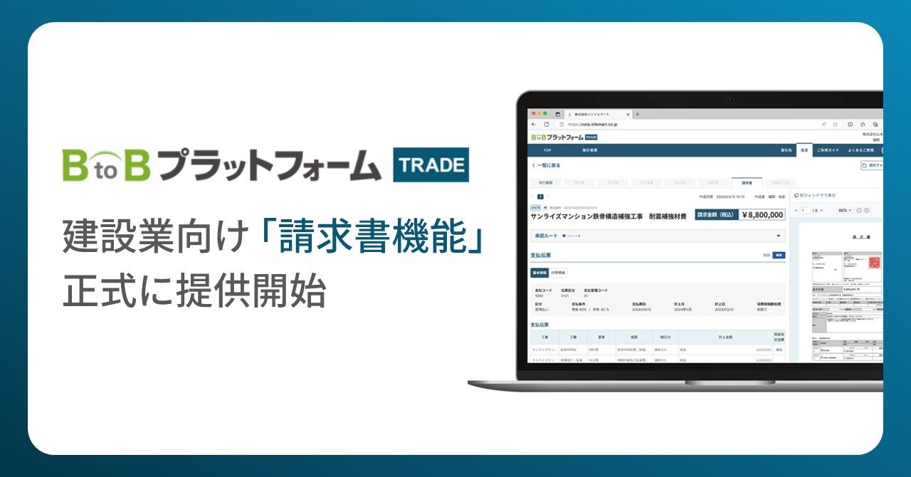 デジタルの力であらゆる業務を効率化する株式会社インフォマート(本社:東京都港区 代表取締役社長:中島 健、以下「当社」)は、当社が提供する企業間の一連の取り引きをデジタル化し、クラウド上で一元管理できる「BtoBプラットフォーム TRADE」において、建設業の商習慣に対応した新機能「請求書機能」を正式に提供開始しました。これにより、請求書受領業務の負担を軽減し、建設業のバックオフィス業務における更なる利便性向上と業務効率化を推進します。