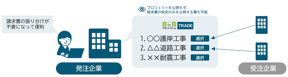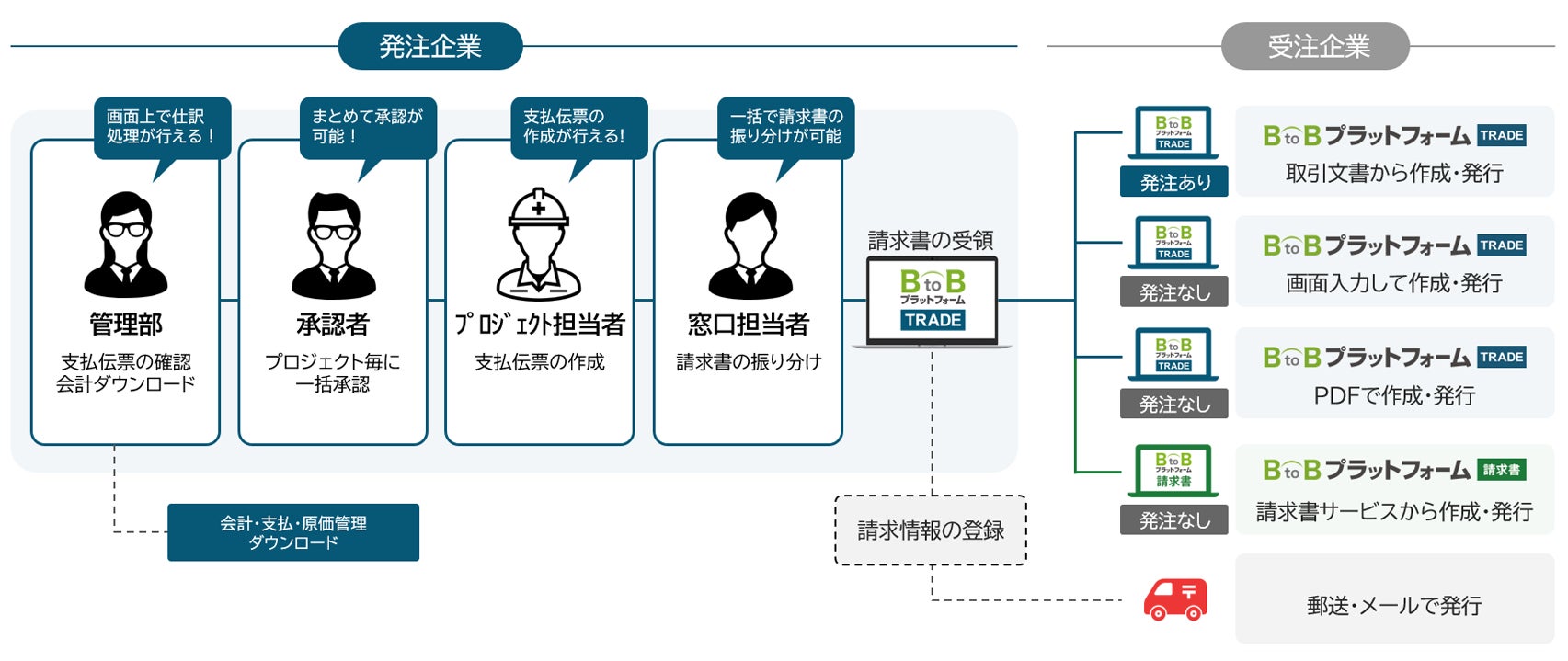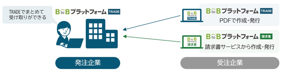 受注企業が本機能を利用した場合、発注企業は、当社が提供する請求書クラウドサービス「BtoBプラットフォーム 請求書」で発行された請求書も、「BtoBプラットフォーム TRADE」上でまとめて受け取ることができます。