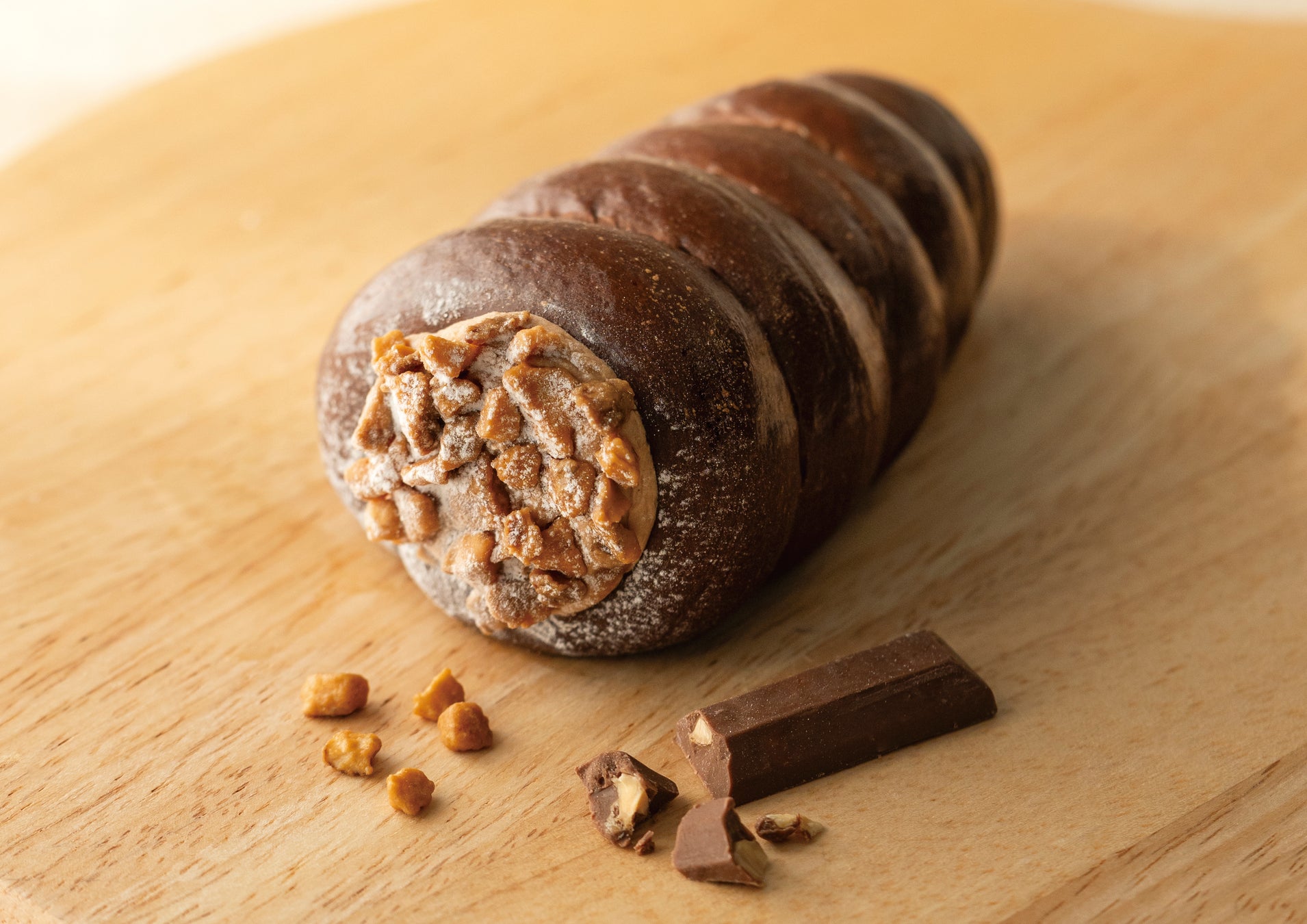 ふわふわのチョコパン生地に、ミルクチョコレートカスタードクリームを詰め、その中にサクサクのミルクチョコレートクランチバーを入れました。香ばしいアーモンドキャラメリゼをトッピングした、香ばしさがたまらない季節限定のコロネです。