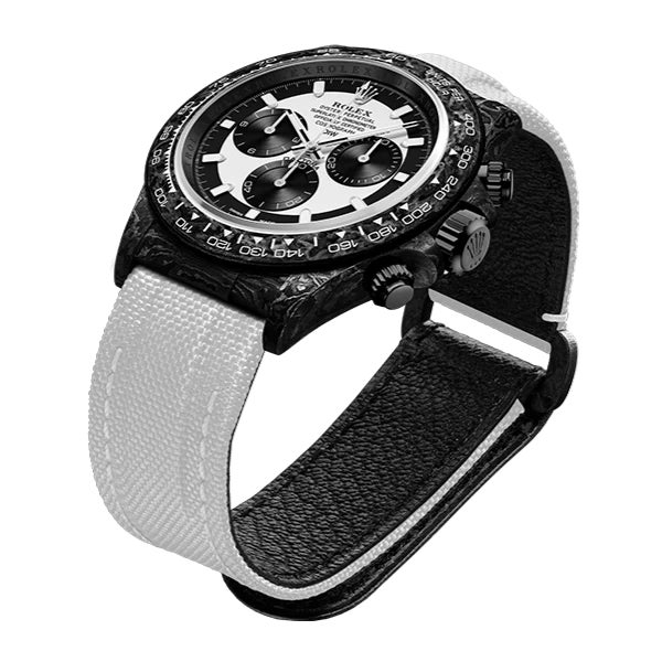 本モデルは、伝統的なツートーンのロレックス デイトナをモチーフに、ブラックカーボンケースとホワイトダイヤル、インデックスが織りなす洗練されたデザインが特徴です。文字盤と調和するスモーキーホワイトのストラップや、微細な仕上げまでこだわったケースからは、職人の技とこだわりを感じることができます。シンプルながら力強く、どんなファッションやシーンにも自然に溶け込む特別なモデルに仕上がっています。
