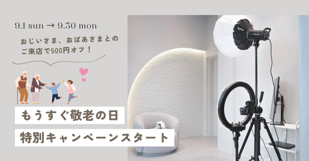 PICmiiは、カメラ専門店「カメラのキタムラ」および写真スタジオ「スタジオマリオ」で培ったノウハウを活かし、撮影画質の仕上がりにこだわったセルフ写真館で、個室での自由な撮影をお楽しみいただけます。9月18日は敬老の日。9/1〜9/31までにおじいさま、おばあさまと一緒にご来店いただくと、ご利用料金より500円OFFとさせていただきます。日頃、家族やおじいちゃん、おばあちゃんとの時間がなかなか取れない方、一緒に過ごしたり感謝の気持ちを伝える機会にぜひご利用ください。