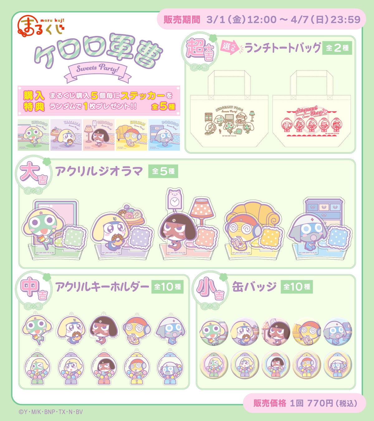 各賞の商品といたしましては、選べるランチトートバッグ、アクリルジオラマ、アクリルキーホルダー、缶バッジなど、かわいらしいデザインでファンの皆様に喜んでいただけるラインナップとなっております。