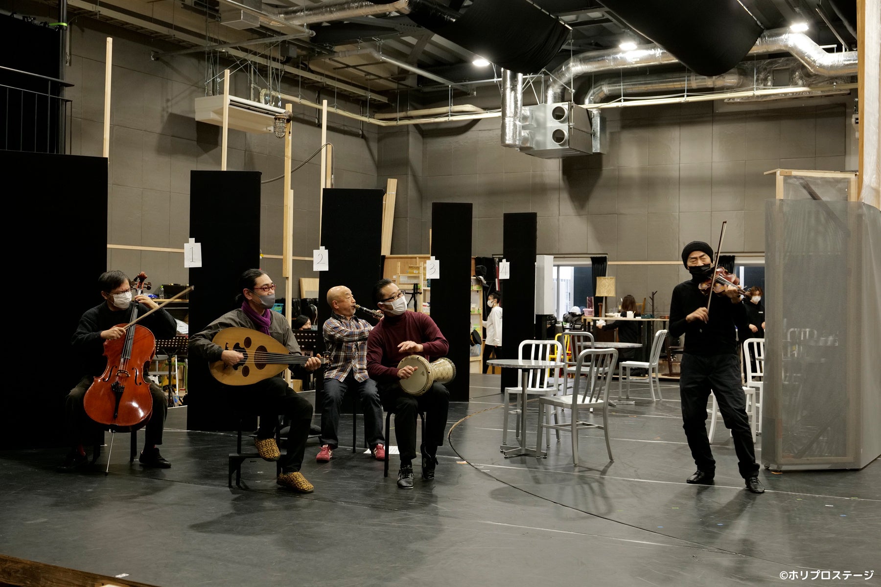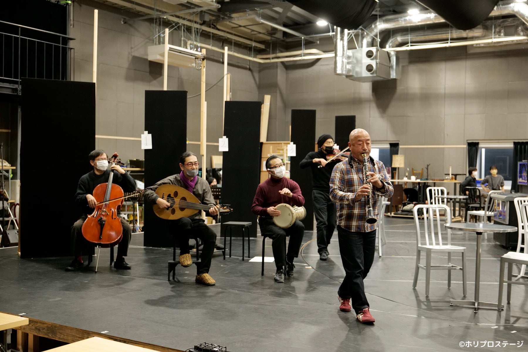 場面転換の際に警察音楽隊の演奏が挟まれる。太田惠資(バイオリン)、梅津和時(マルチリード)、星 衛(チェロ)、常味裕司(ウード)、立岩潤三(ダルブッカ)による演奏は、中東の雰囲気がありながらもどこか聞き馴染みが良く、何よりオンステージによって演奏されることでの迫力は、他作品では味わえない魅力の一つとなっている。中央に設置された回転盆と組み合わせた演奏の演出も非常に効果的であった。