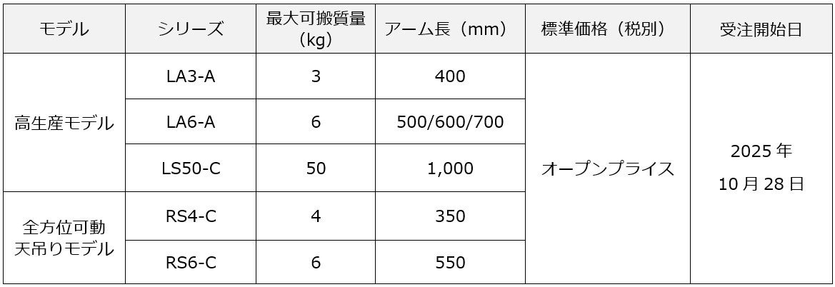 エプソン販売株式会社は、産業用ロボットの新商品として、スカラ(水平多関節)ロボット『LA3/6-A』シリーズ、『LS50-C』シリーズ、『RS4/6-C』シリーズを2025年10月28日より受注開始します。併せて、定額保守サービスの受注も同日より開始します。