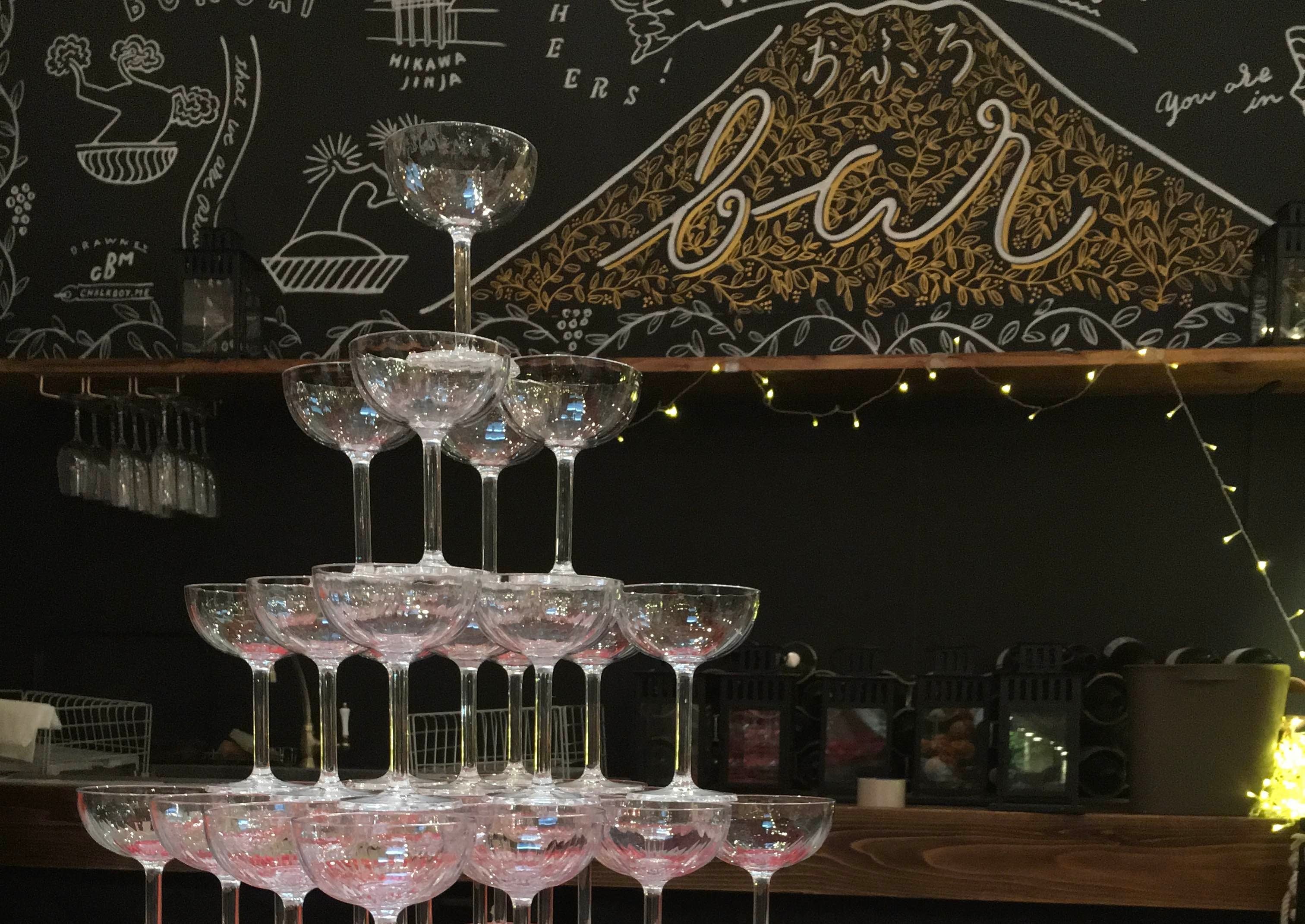 周年祭の最後はシャンパンタワーの無料振る舞いで締めくくりましょう。