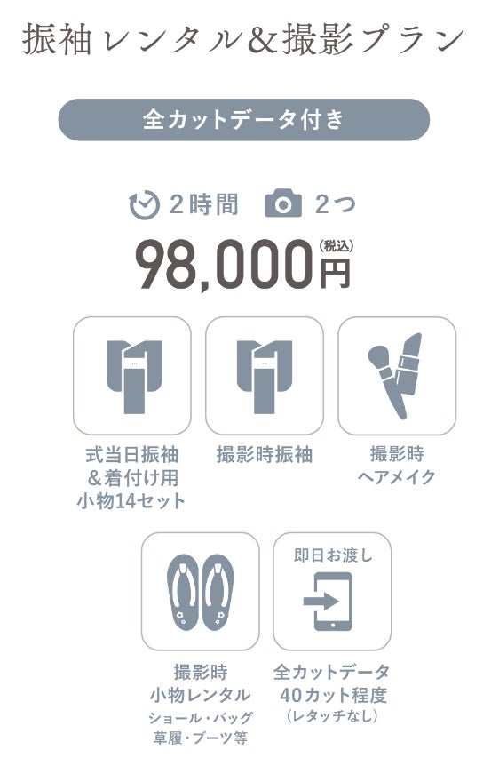 式当日の振袖レンタルに、前撮り撮影が付いた人気プラン。