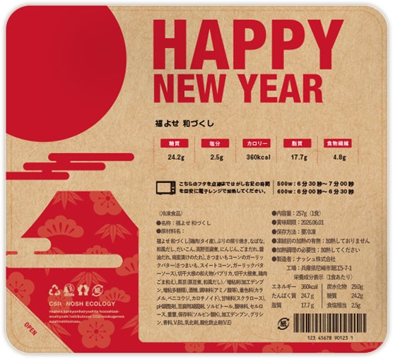商品を受け取った瞬間からワクワク感をお楽しみいただけるよう、お正月限定デザインのパッケージを採用しています。細部にまでこだわったナッシュの商品をぜひお楽しみください。