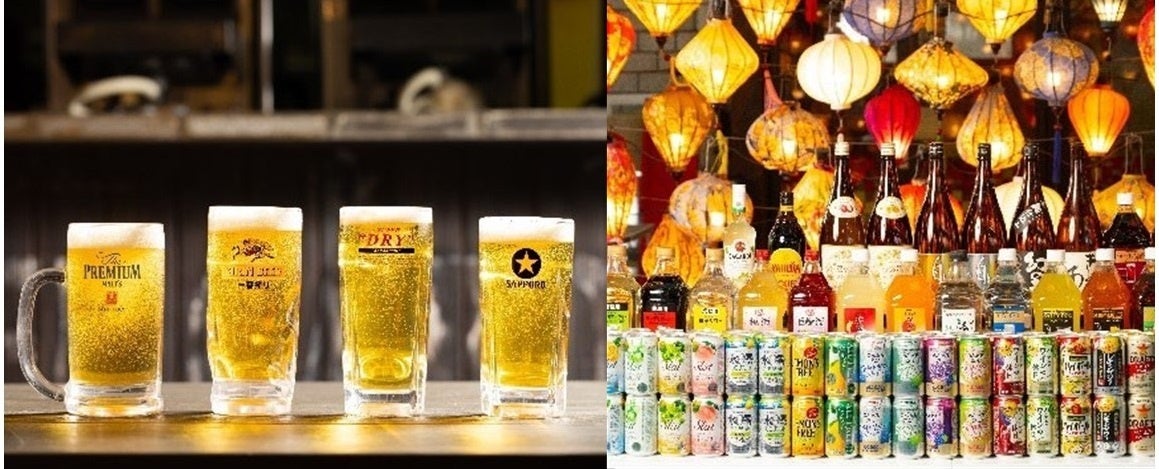 大手4社(アサヒ・サントリー・キリン・サッポロ)のビールが飲み放題となる、ビール好きにはたまらないラインナップです。ハイボールにレモンサワー、カクテルに焼酎やウイスキー、ノンアルなどお客様のニーズに合わせた豊富なドリンクを用意しています。