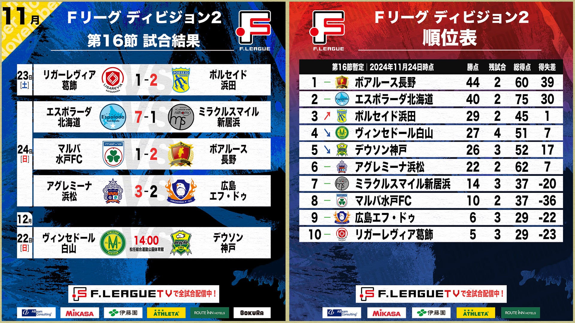 11月23日(土)〜24日(日)に実施したFリーグ2024-2025 ディビジョン2 第16節の4試合について結果をお知らせいたします。
