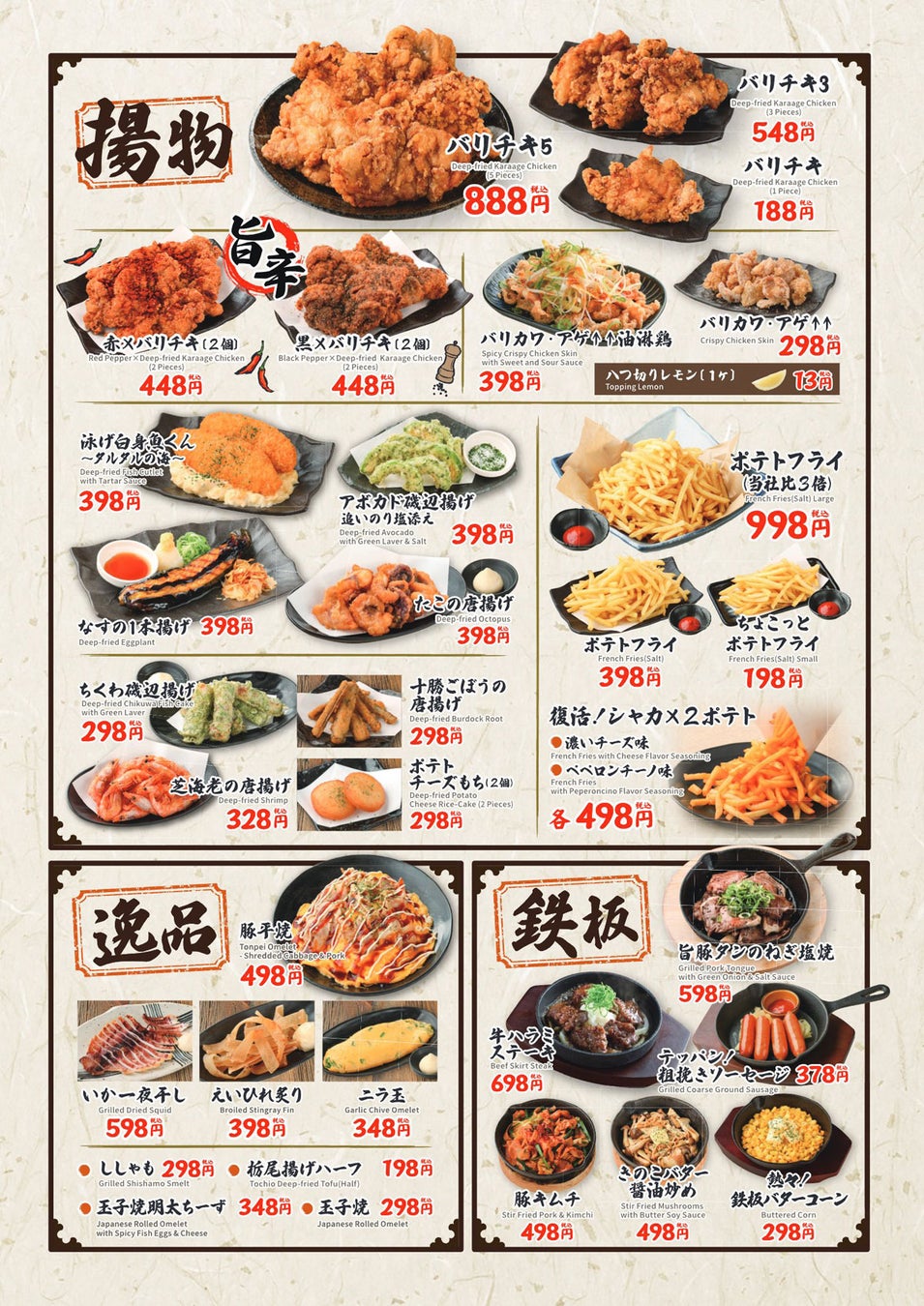 皮(かわ)・手羽を使った当店いち推しのバリヤス価格メニュー!