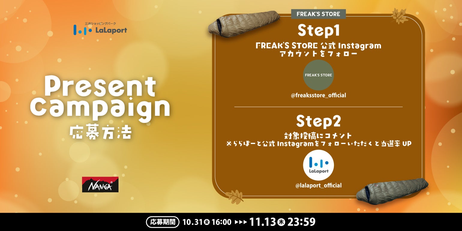 毎年大好評のNANGA×FREAK’S STOREコラボレーションを記念し、2025 年 10 月 31 日(金)~ 11 月 13日(木)期間中、『ららぽーとで見つかる!FREAK‘S STOREのNANGAであったか冬支度。NANGA寝袋が抽選で5名様に当たるキャンペーン』を開催。