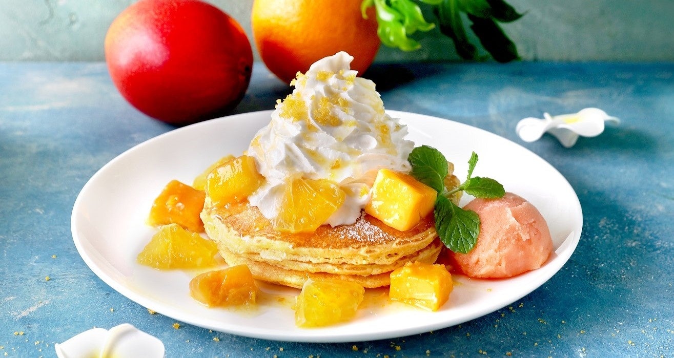 クア・アイナの夏限定「マンゴーとオレンジのパンケーキ」が新登場 探し求めたタイ産のマハチャノックマンゴーをゴロゴロ贅沢に使用!ひんやりシチリアオレンジシャーベットを添えて