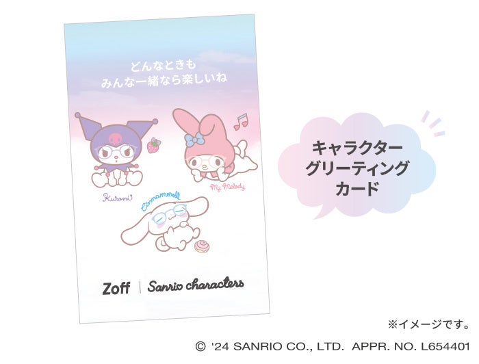 イベント当日限定、Zoff 池袋サンシャインシティ・アルパ店で「Zoff | Sanrio characters」購入先着600名様に、クロミ、シナモロール、マイメロディが仲良くならんだデザインがキュートな「キャラクターグリーティングカード」をプレゼント。