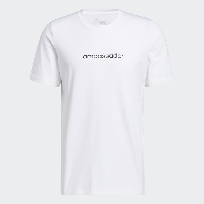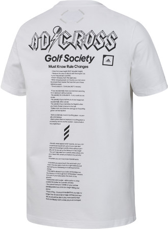 背面の大胆なグラフィックプリントにはゴルフの新しいルールが書かれたユニークなTシャツ。
