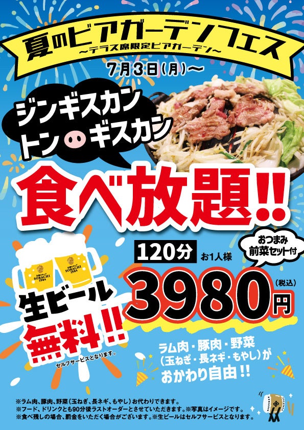 気温が上がり夏バテしやすいこの時期、美味しい料理をご堪能いただき、お腹も心も満たし、夏の疲れを吹き飛ばすスタミナを付けていただきたいと考え、テラス席限定でジンギスカン&トンギスカンの食べ放題をご用意いたしました。