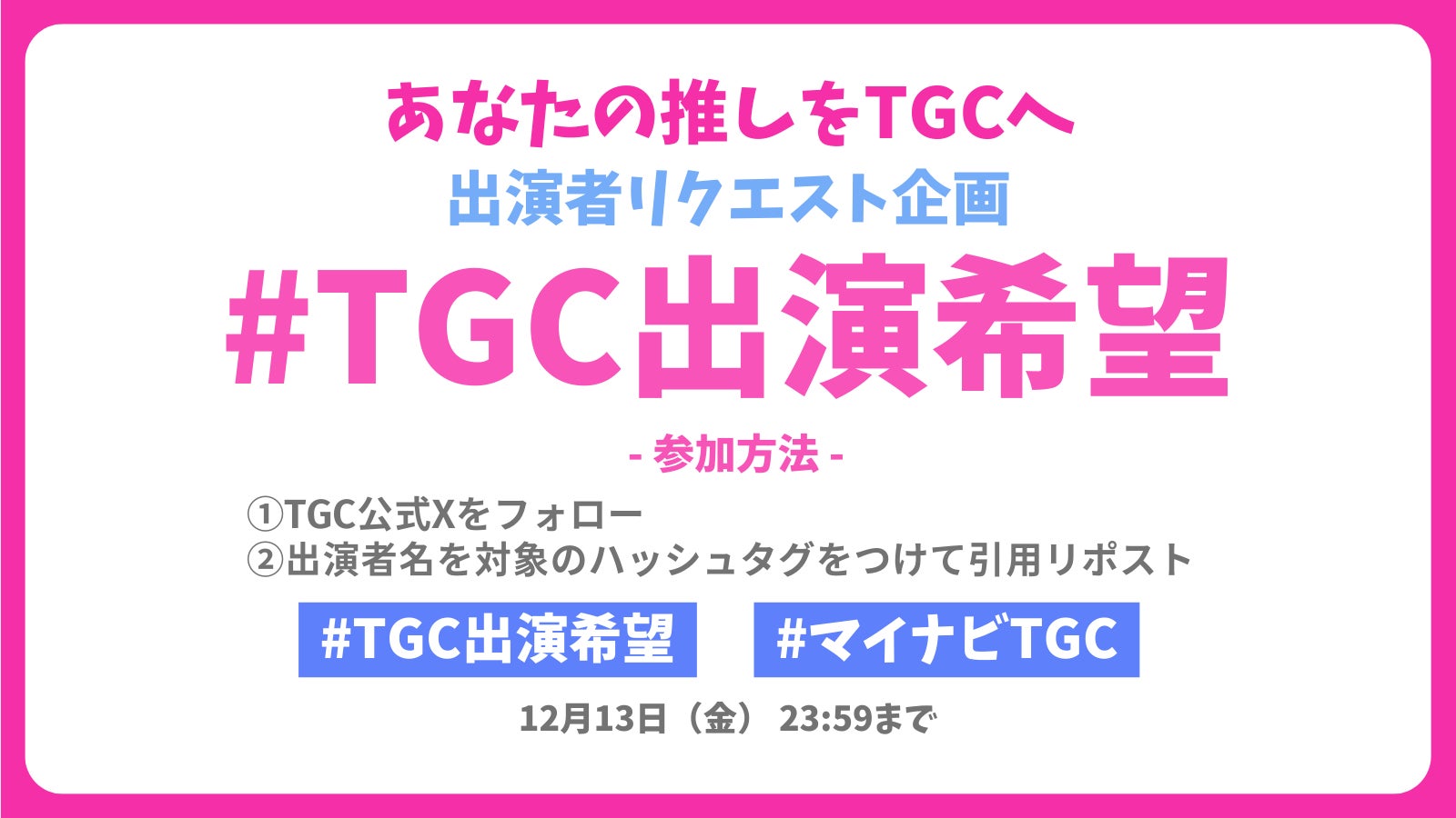 TGC公式Xでは、⼤⼈気企画「#TGC出演希望」がスタート!40回目となるアニバーサリー開催のTGCで、みんなが⾒たい出演者を⼤募集します。また、開催決定を記念してAmazonギフト券が当たる「#TGCにおねだり」キャンペーンも同時開催!Wエントリーで当選確率UP!受付期間は12⽉13⽇(⾦)まで。詳細はTGC公式X(@TGCnews)をチェック!