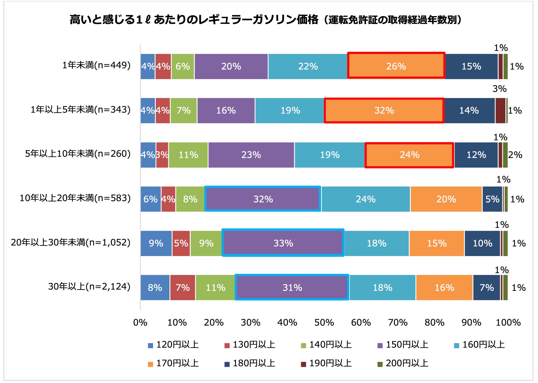 運転免許証の取得経過年数別に見ると、免許を取得してから10年未満までは「170円以上」が最も多くなった一方で、10年以上は「150円以上」が最多でした。取得経過年数が10年以上の人は、120円台のガソリン価格を経験していることから、取得経過年数が短い人と比べると高いと感じる価格帯が低くなっているものと思われます。