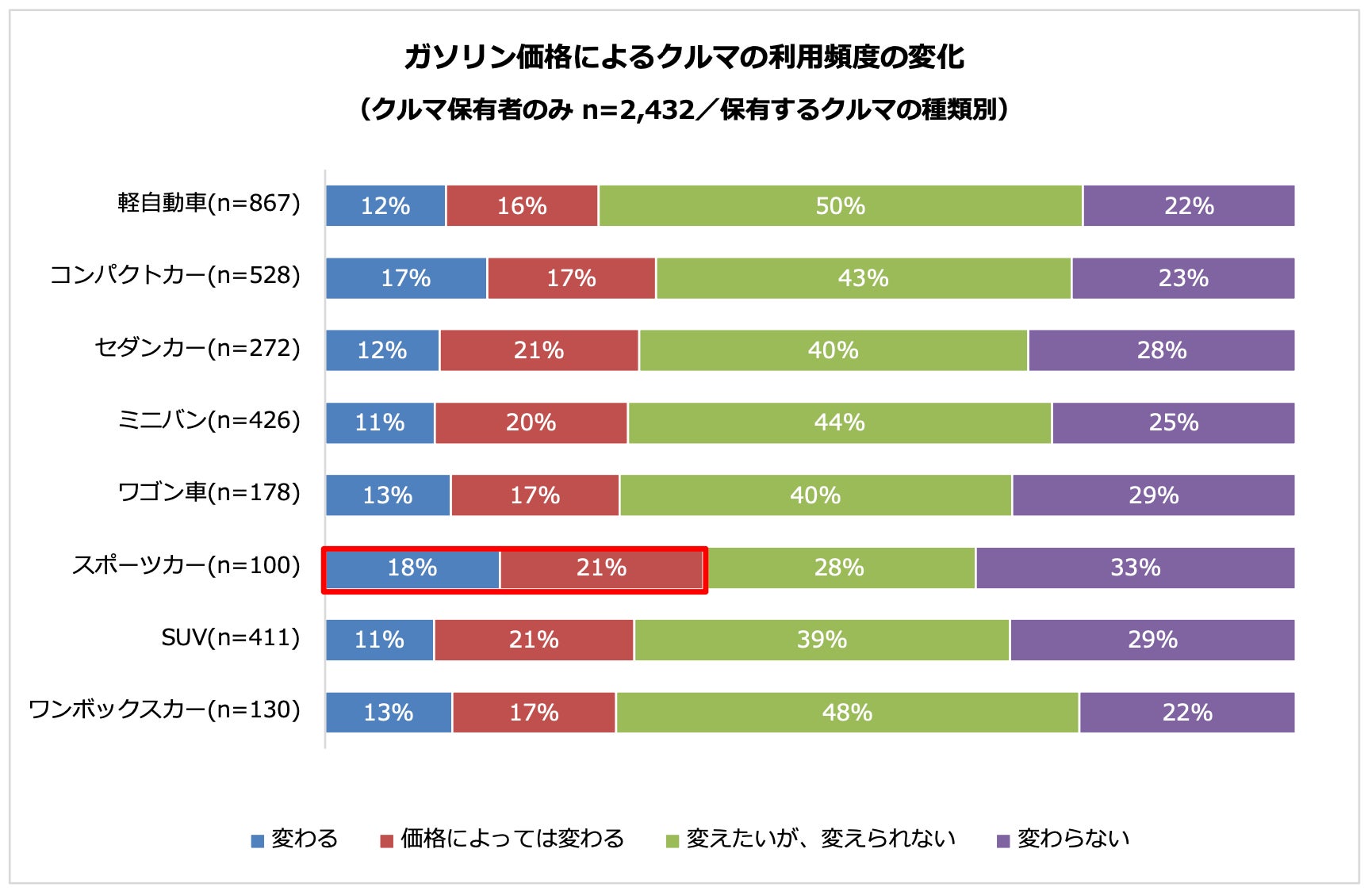保有しているクルマの種類別では、「スポーツカー」が「変わる」と「価格によっては変わる」を合わせて39%で最多となりました。「スポーツカー」はハイオクガソリンが採用されていることが多く、レギュラーガソリンよりも20〜30円価格が高いことなどから、他のクルマの種類と比べて利用頻度を変える人が多いものと思われます。
