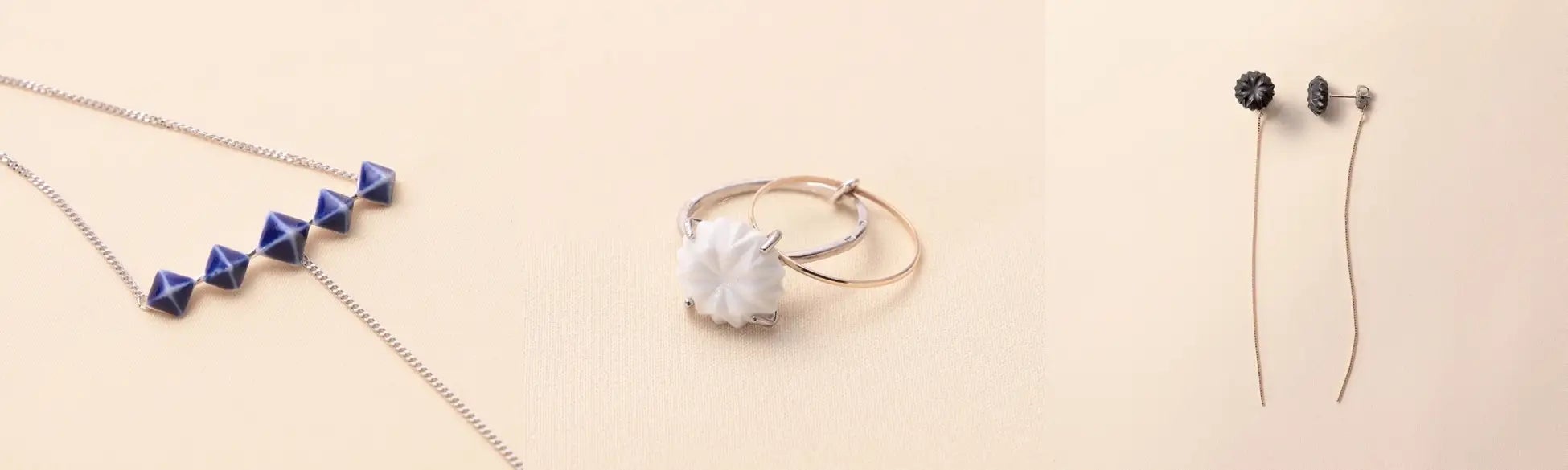 肥前地区を代表する5つの窯元の陶磁器をベースにしたジュエリーコレクションが〈HIZEN jewelry〉です。産地ごとに特性が異なる個性を持つ陶磁器をジュエリーという新たなカテゴリーで表現します。