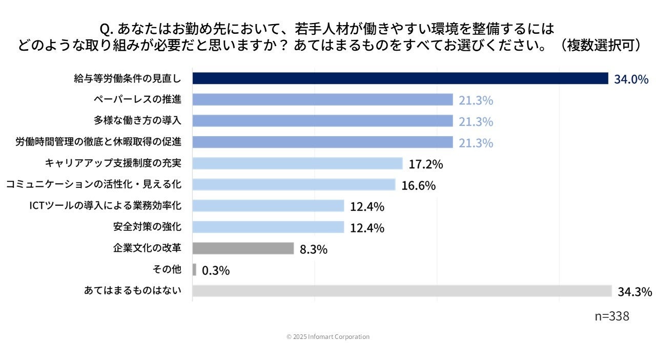 高齢化による人材育成が課題になっている中、若手人材が働きやすい環境を整備するために必要な取り組みを聞いたところ(n=338)、「給与等労働条件の見直し」が最多で34.0%、次いで「ペーパーレスの推進」「多様な働き方の導入」「労働時間管理の徹底と休暇取得の促進」がいずれも21.3%となりました。