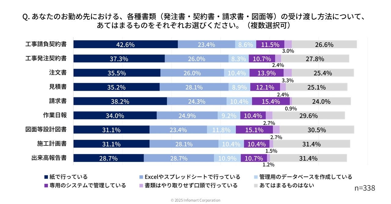 各種書類(発注書・契約書・請求書・図面等)の受け渡し方法について聞いたところ(n=338)、いずれの書類においても「紙で行っている」が3割〜4割となりました。