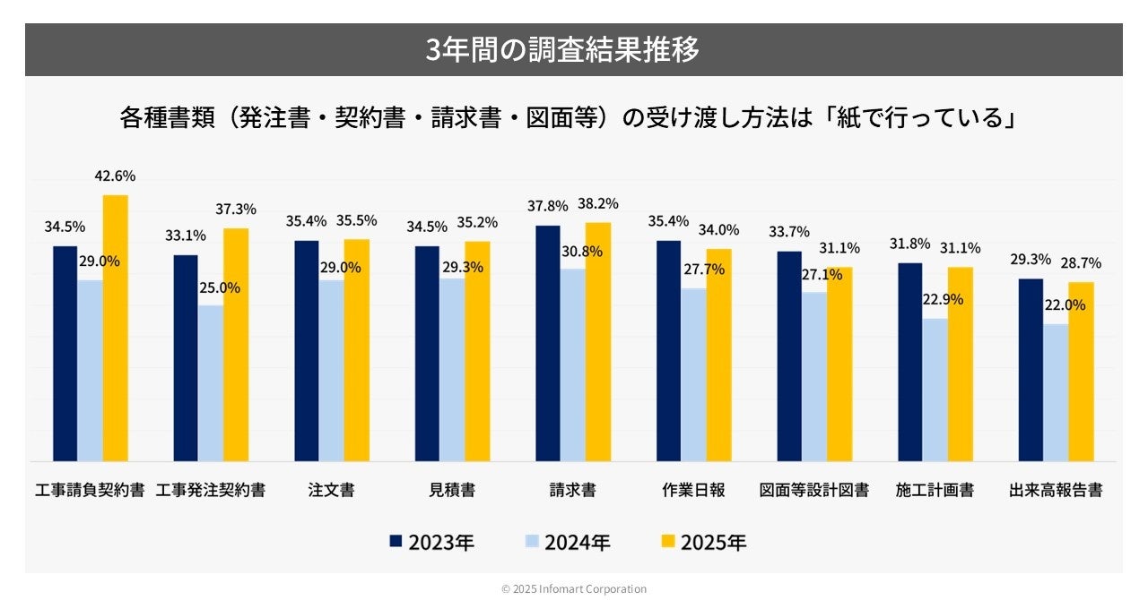 3年間の調査結果を比較、帳票類のやり取りは「紙で行っている」が昨年より増加