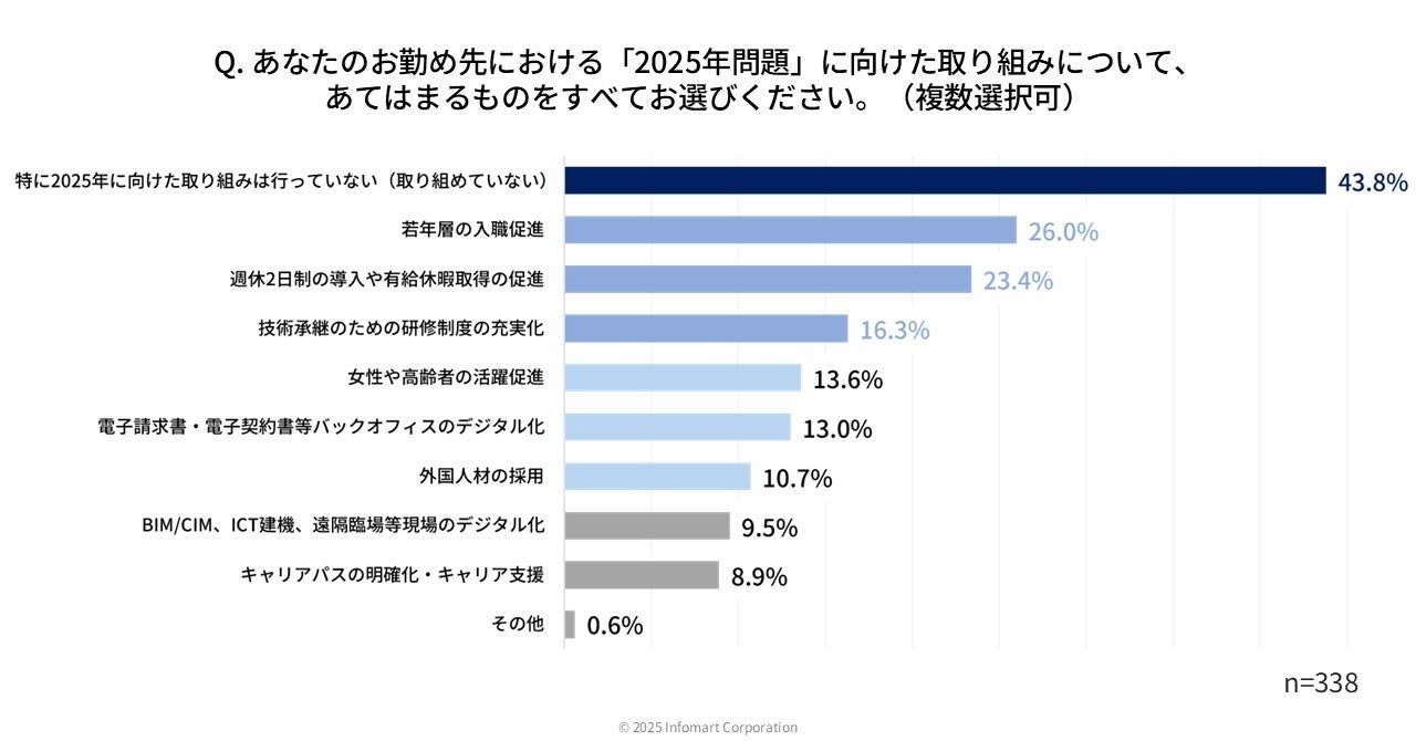 あわせて、2025年問題に向けた取り組み状況について聞いたところ(n=338)、「特に2025年に向けた取り組みは行っていない(取り組めていない)」が43.8%で最多となり、取り組めていない企業も多いことが分かりました。