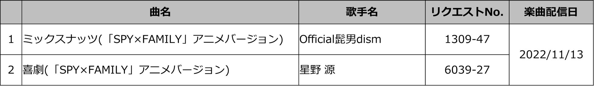 株式会社第一興商は、通信カラオケDAMに、テレビアニメ『SPY×FAMILY』のOfficial髭男dismが歌う第1クールオープニングテーマ(以下、OPテーマ)「ミックスナッツ」と、星野源が歌う第1クールエンディングテーマ(以下、EDテーマ)「喜劇」を、フルサイズのアニメ映像で11月13日より配信*します。