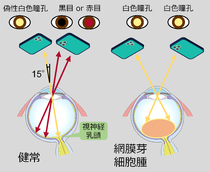 図1:偽性白色瞳孔が起きる機序。健常児では通常、補助光を用いた撮影の際に、反射がない(黒目)か、網膜からの反射による赤色瞳孔(赤目)を呈するが、外側15°から光が入ると視神経乳頭(視神経円板)からの反射によって偽性白色瞳孔を示す。なお、網膜芽細胞腫による白色瞳孔では、観察される角度は局在やサイズにより異なるが、腫瘍の増大に伴い白色瞳孔を呈する頻度(白色瞳孔となる角度の割合)が増える。