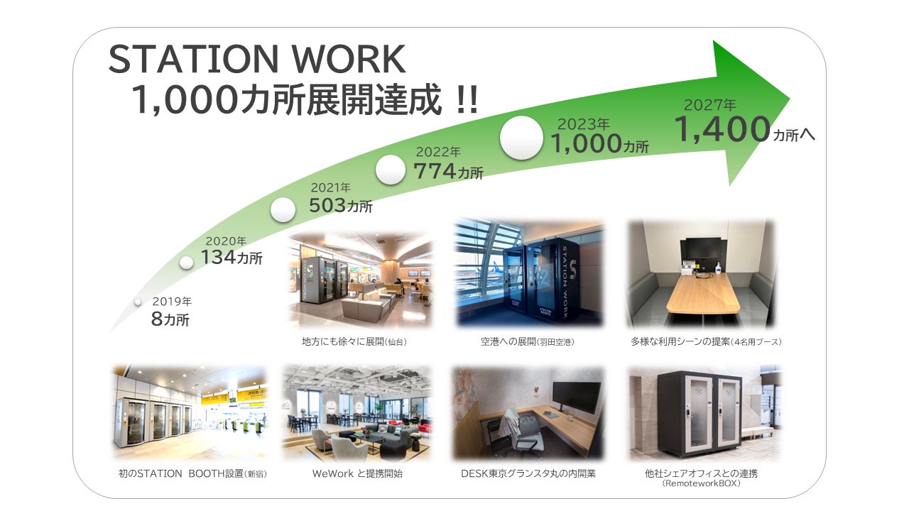 STATION WORKは2019年8月1日のサービス開始以来、エキナカ・マチナカを中心としたネットワークの拡大に取り組んできました。2023年12月26日に1,000カ所を達成し、拠点数は1,013カ所となります。会員数は法人会員・個人会員併せて約42万人となり、多くのお客さまにご利用いただいています。今後もお客さまのニーズに合わせた拡大や利用シーンの提案を進めていきます。