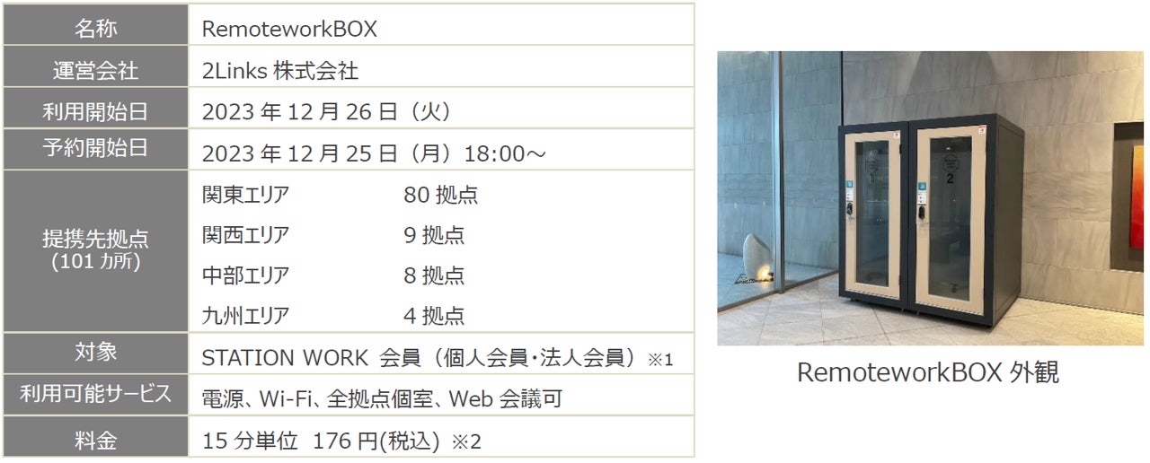 今回新たに、2Links株式会社が運営する個室ブース型シェアオフィス「RemoteworkBOX」との提携を開始します。STATION WORK会員は全国101カ所のRemoteworkBOX拠点を2023年12月26日より利用できるようになります。会議室やオフィス、カフェのエリア内に拠点があり、全拠点が個室空間のため、外出先でのオンライン会議も情報漏洩の心配をすることなく実施いただくことが可能です。本連携により、広範な地域での働き方をサポートします。