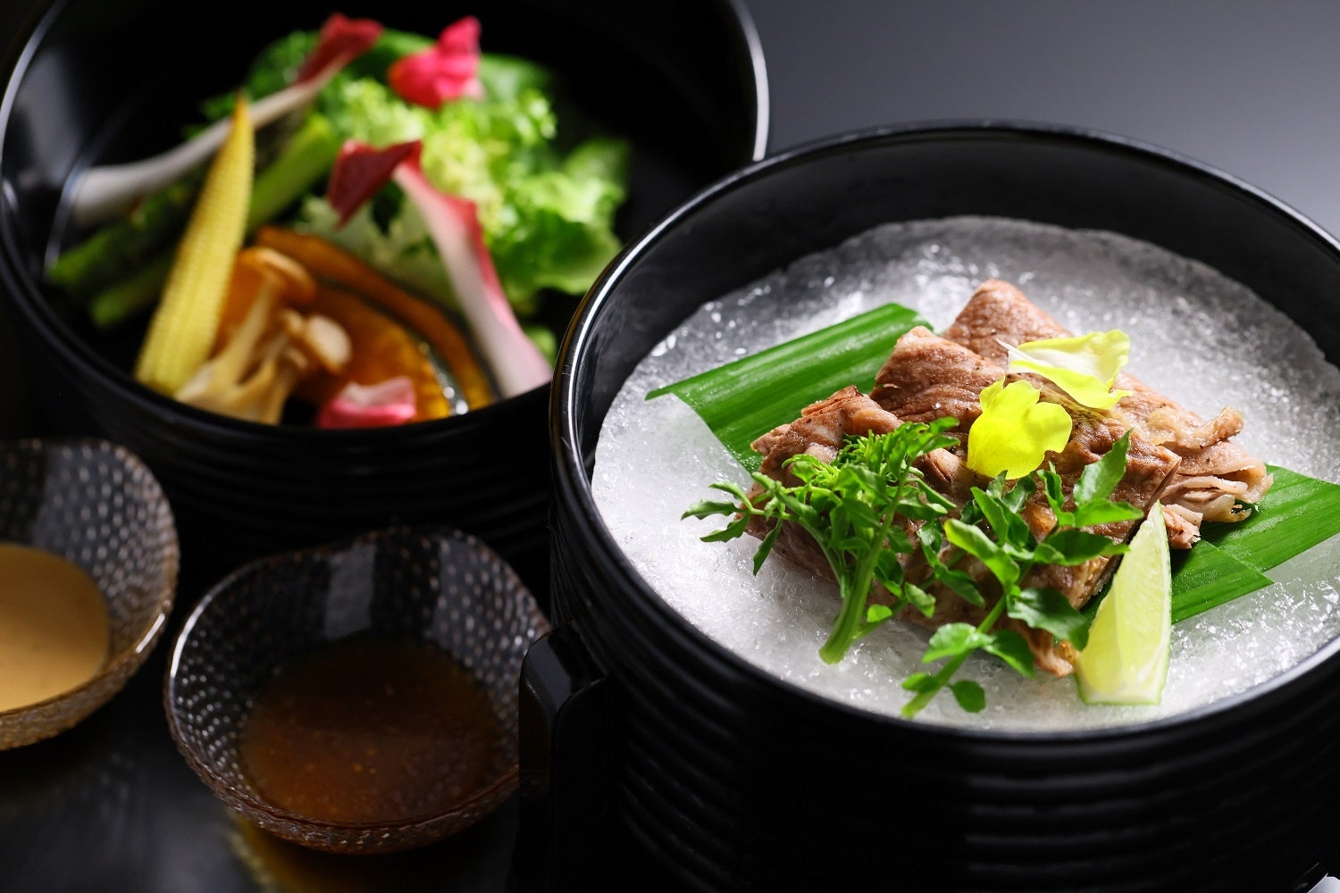 冷しゃぶに合わせて南瓜やアスパラガス、ヤングコーンといった夏が旬の野菜たちは火を通してご用意。野菜を加熱することで、身体が冷えにくくなりますように工夫致しました。