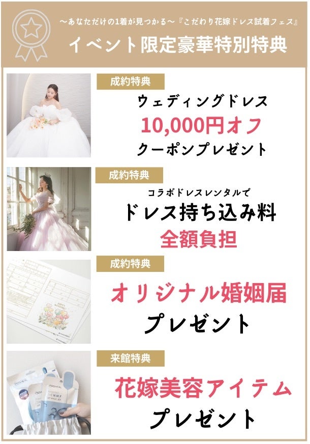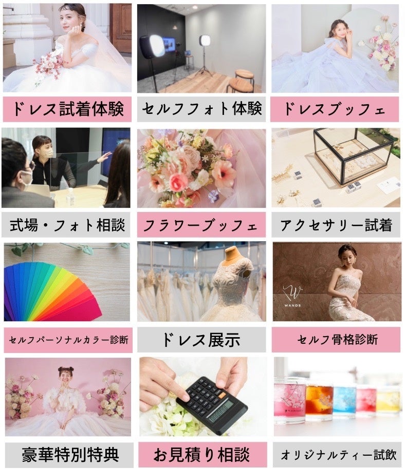 今回のイベントはウェディングドレス試着やセルフパーソナルカラー診断、フォト体験など体験型のフェスに参加し楽しむことが可能。自分だけのコーディネートを選んで撮影体験ができることも魅力の1つ。※ご試着に関しましては 1着1000円、2着2000円、3着3000円とさせていただいております! 試着頂いた中からご購入を頂きましたら 試着費用は頂いておりません。 ご試着はお一人3着までのご案内とさせて頂いております。