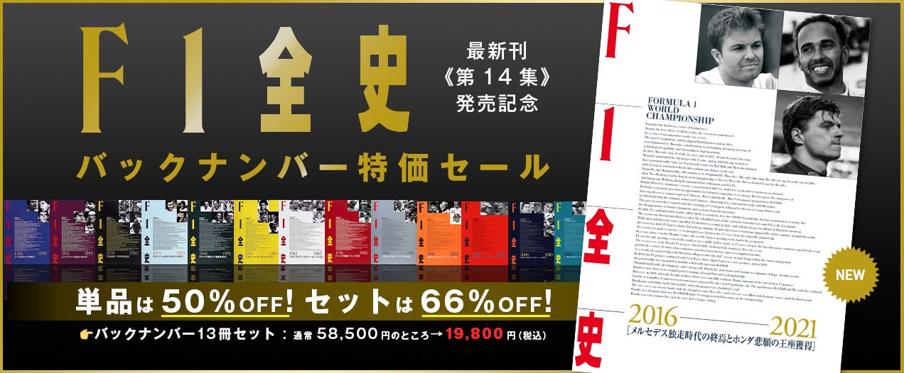 株式会社三栄(本社所在地:東京都新宿区、代表取締役社長:伊藤秀伸)は、2022年7月29日より『F1全史 第14集 2016-2021』を発売いたします。これを記念して、三栄の電子書籍を販売するASB電子雑誌書店グループでは、F1全史(電子書籍)のバックナンバーが全て50%OFFとなるセールを実施します。また、全バックナンバーをまとめた13冊セット(通常定価:58,500円)は超特価の19,800円(66%OFF)となります。