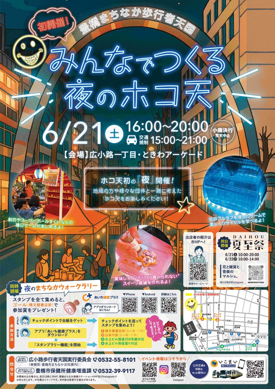 当日は、豊橋駅の南側にある「水上ビル」で大豊商店街が主催するイベント、花と雑貨と音楽のマルシェ「DAIHOU夏至祭」が開催されます。これに合わせ、ホコ天と夏至祭を巡る「夜のまちなかウォークラリー」が行われます。各会場2カ所ずつチェックポイントが設けられ、すべてのポイントでスタンプを集めると参加賞が贈られます。賞品は当日のお楽しみ!