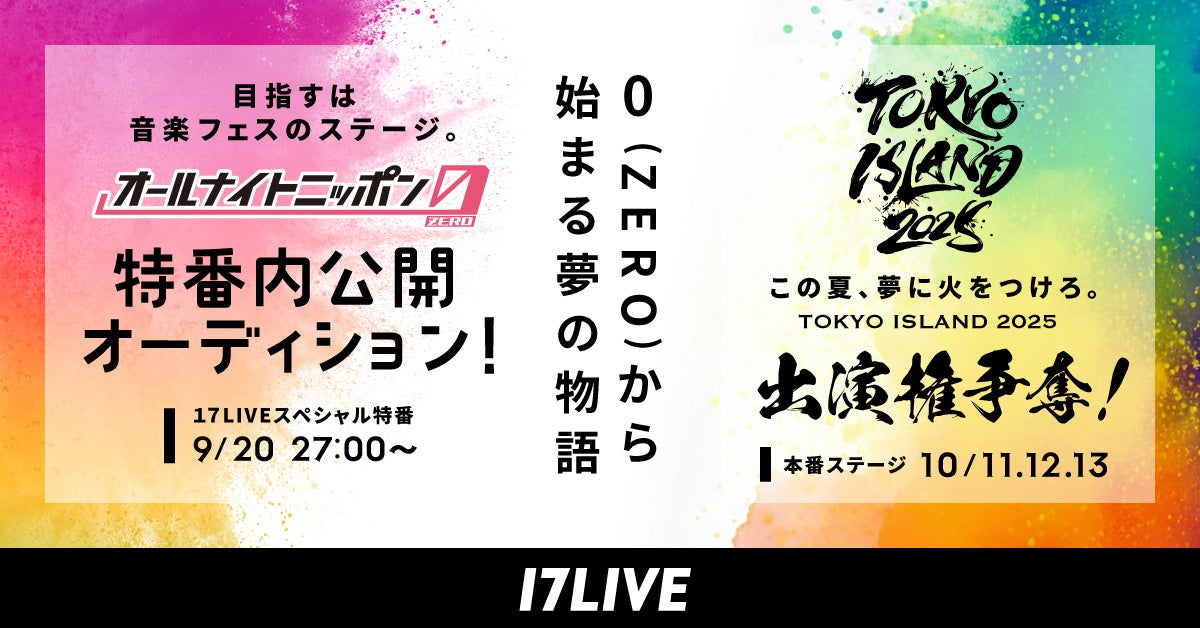 17LIVE株式会社(東京都渋谷区、代表取締役:ジャン・ホンフイ、URL:https://jp.17.live/)が運営する日本最大級のライブ配信アプリ「17LIVE(イチナナ)」は、2025年10月11日(土)から10月13日(月・祝)の3日間、都内で開催する大型野外フェスティバル「TOKYO ISLAND 2025」へ出演するライバーを決定するオーディションイベント、『TOKYO ISLAND 2025出演権争奪!オールナイトニッポン0(ZERO)特番内公開オーディション!』を、2025年7月14日(月)より開催することが決定しましたので、お知らせいたします。