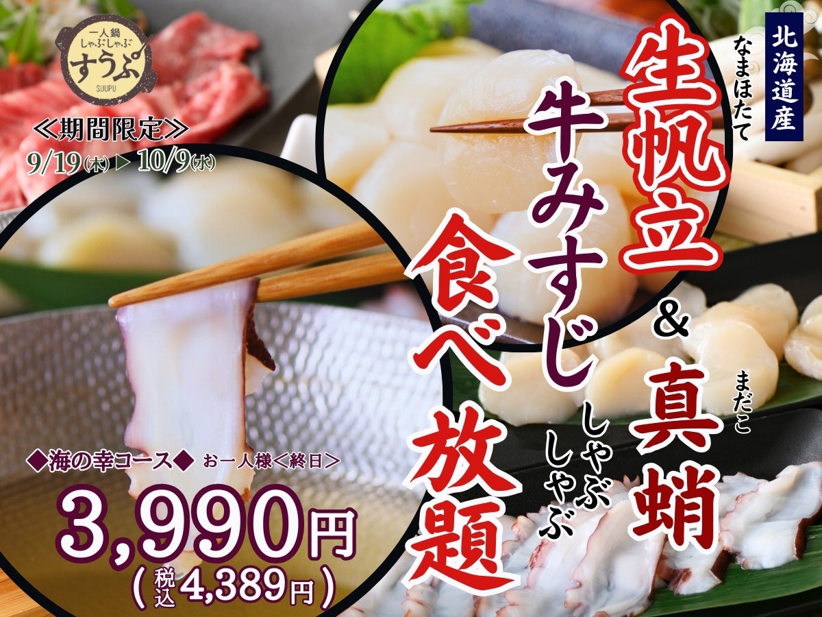 【充実の海の幸で豪華絢爛しゃぶしゃぶ食べ放題‼】10/9迄の期間限定!台湾飲茶と一人鍋しゃぶしゃぶ『すうぷ静岡パルコ』にて『生帆立・真蛸』の海の幸と『牛みすじ』が堪能できる特別コースが新登場!
