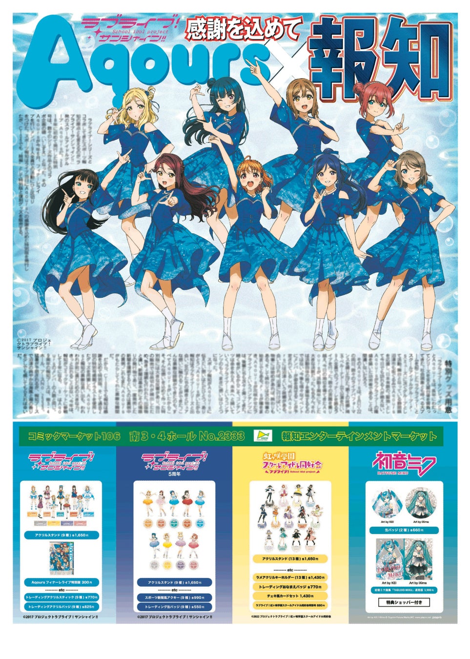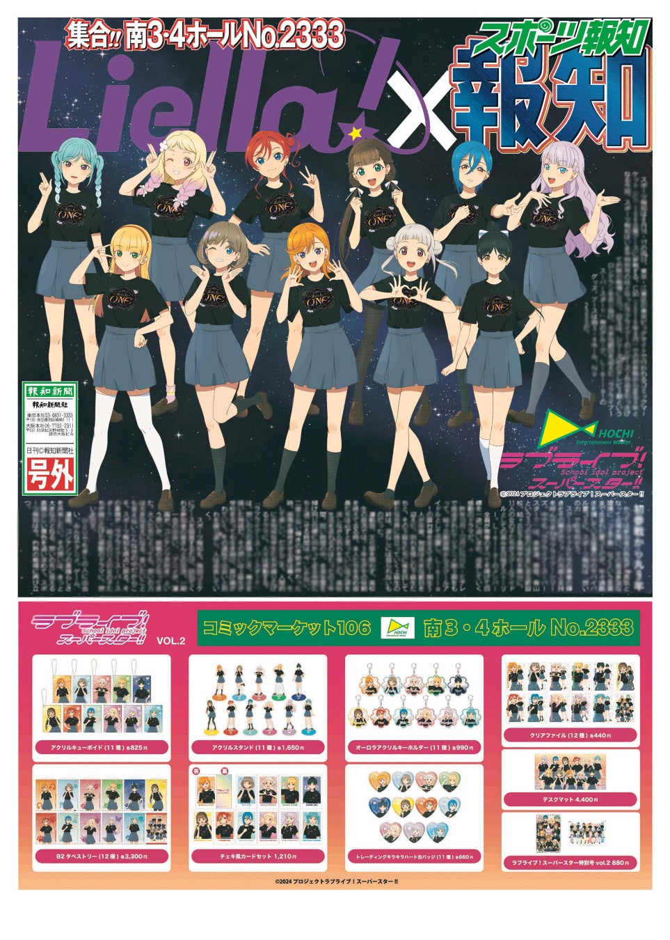 コミケ106H.O.E.M.ブースでは、恒例のコミケ特製号外無料配布も行います。今回は「ラブライブ!スーパースター!!」と「ラブライブ!サンシャイン!!」のダブルA面号外で、両面ともに当該作品イラストが全面的にフィーチャーされた特別仕様となっております。特別号外は期間中にブース付近で終日配布します(※なくなり次第終了)。