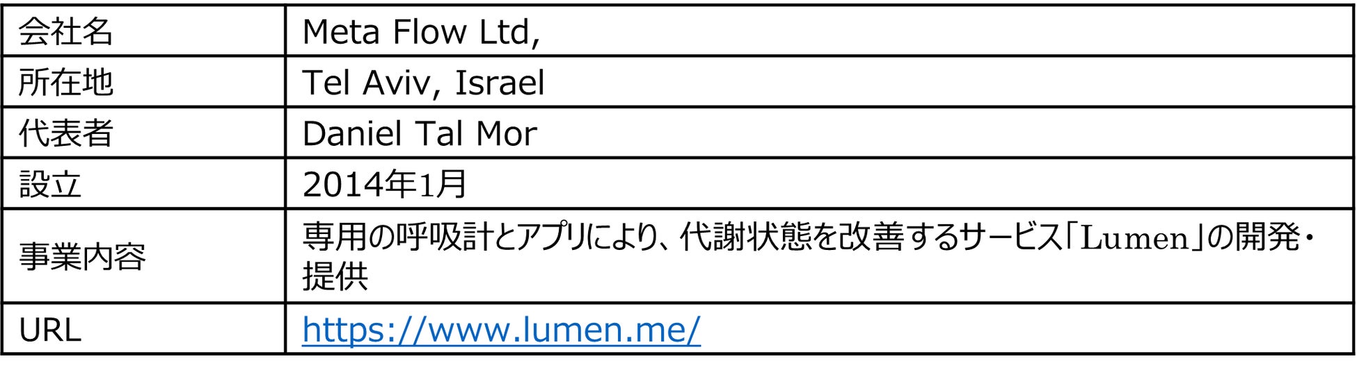 Meta Flow社は、世界各国で大きな健康課題である肥満対策市場を主な事業領域とし、専用の呼吸計とアプリを通じてユーザーの代謝状態を改善するサービス「Lumen」を展開するスタートアップ企業です。肥満対策を通じた健康増進は当社にとっても重要なテーマであり、同社との連携を通じて市場の反応を注視するとともに、将来的な協業の可能性を探索していきます。