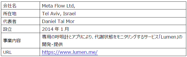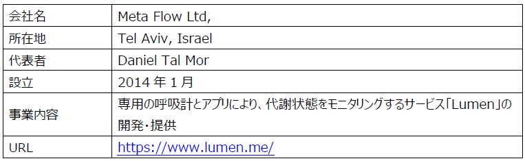 Meta Flow社は、世界各国で大きな健康課題である肥満対策市場を主な事業領域とし、専用の呼吸計とアプリを通じてユーザーの代謝状態をモニタリング改善するサービス「Lumen」を展開するスタートアップ企業です。肥満対策を通じた健康増進は当社にとっても重要なテーマであり、同社との連携を通じて市場の反応を注視するとともに、将来的な協業の可能性を探索していきます。