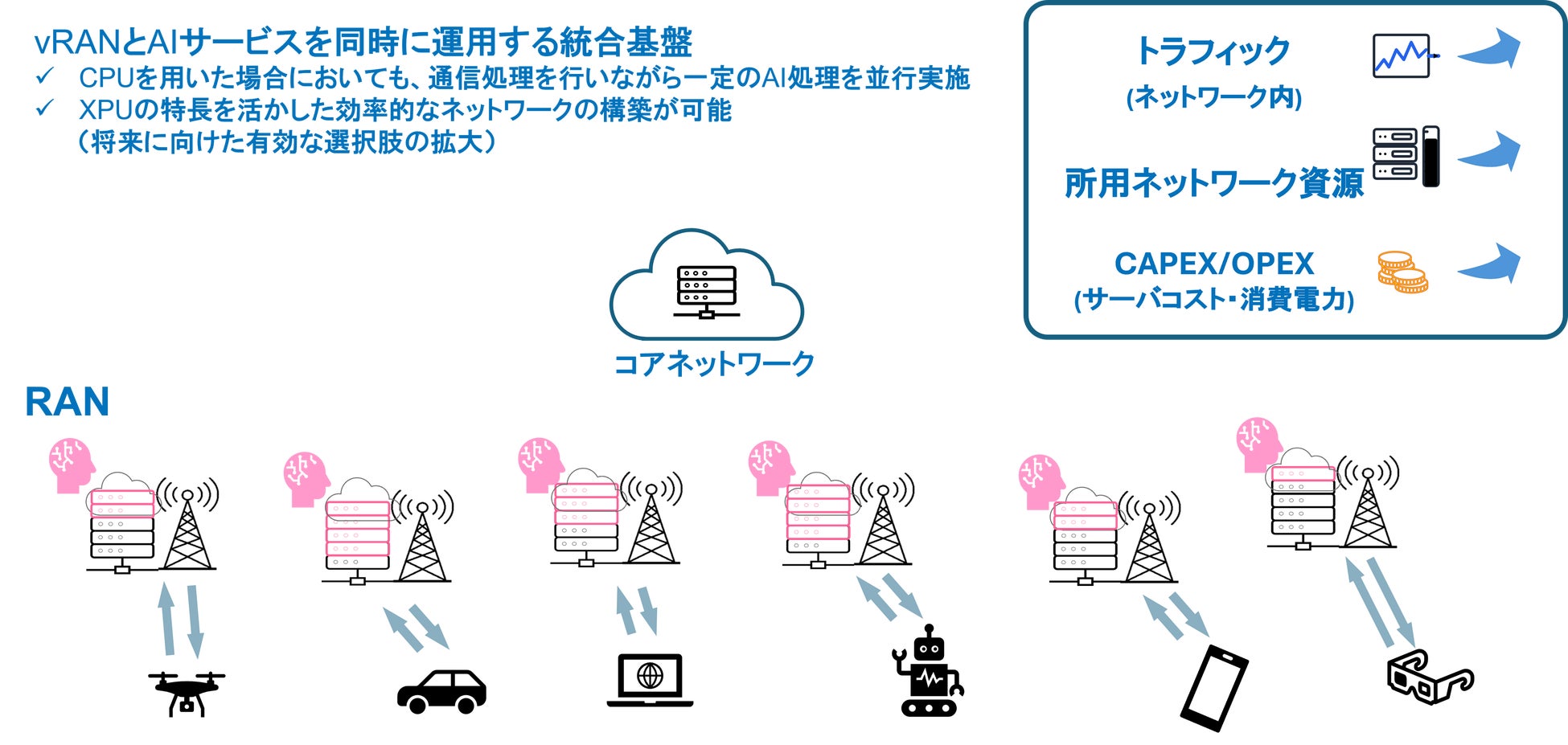 今回ドコモは、汎用的なサーバに搭載されるCPUリソースを活用し、vRANとAIサービスを同時に動