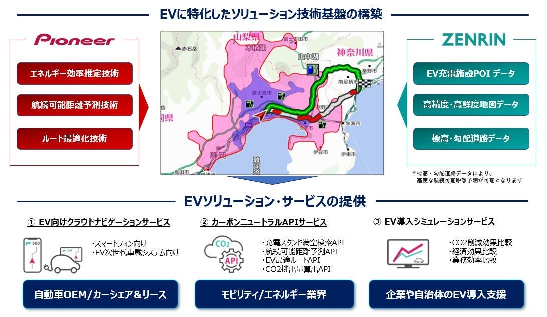 本パートナーシップ契約は、EV利用時の課題解決と利便性向上に特化したソリューションを開発できる技術基盤の構築およびソリューション/サービスの提供を目的としています。具体的には、パイオニアのルート最適化技術と特許取得済みのエネルギー効率推定技術(燃費/電力消費率)により車の移動に伴うCO2排出削減をサポートするクラウドプラットホーム“Piomatix for Green”と、ゼンリンが有する標高・勾配データを含む高精度・高鮮度な地図データや全国を網羅するEV充電施設POI※1データとその提供ノウハウを活用し、EV向けのソリューション/サービスを開発、提供していきます。