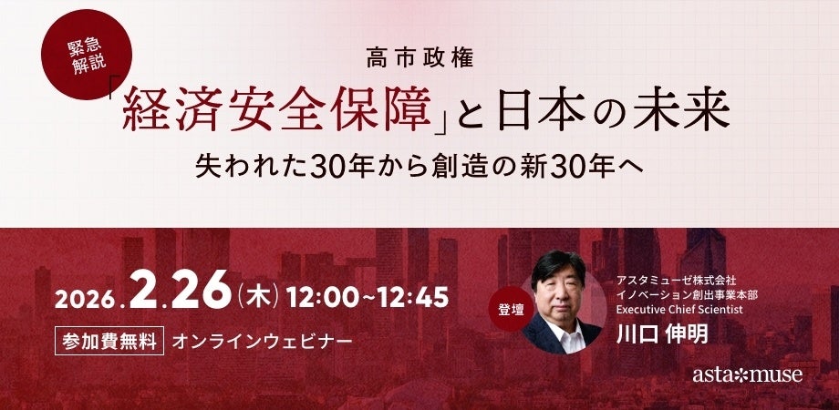 アスタミューゼ株式会社(本社:東京都千代田区、代表取締役社長 永井歩)は、高市政権の最重要課題の一つである「経済安全保障」にフォーカスした緊急ウェビナーを2月26日(木)に開催いたします。