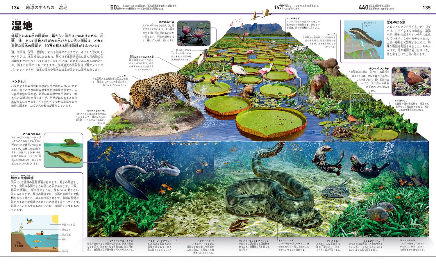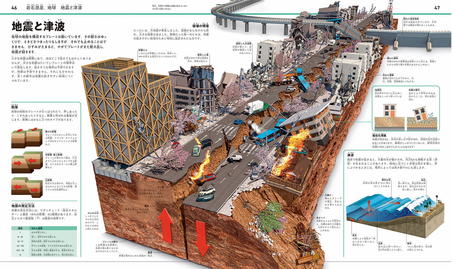 また、600点以上を収録している図版では、滝、洞窟、森、都市、そして地球そのものまで、大迫力のCG断面図で立体的に図解しています。災害が起こるしくみ、気候変動の危機、持続可能な都市のつくりかた―― それらの複雑なメカニズムを理解し、私たちと自然との共生を考えるためにこれから知っておくべき最新の知識が詰まった画期的な図鑑となっています。
