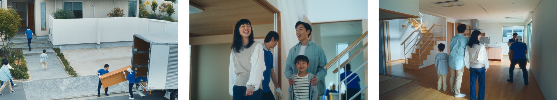 新居への引越しを迎えた3人の家族。家の前に停められた引越しトラックから家財が家に運び込まれ、室内に配置されていく。その様子を笑顔で眺めていた家族。