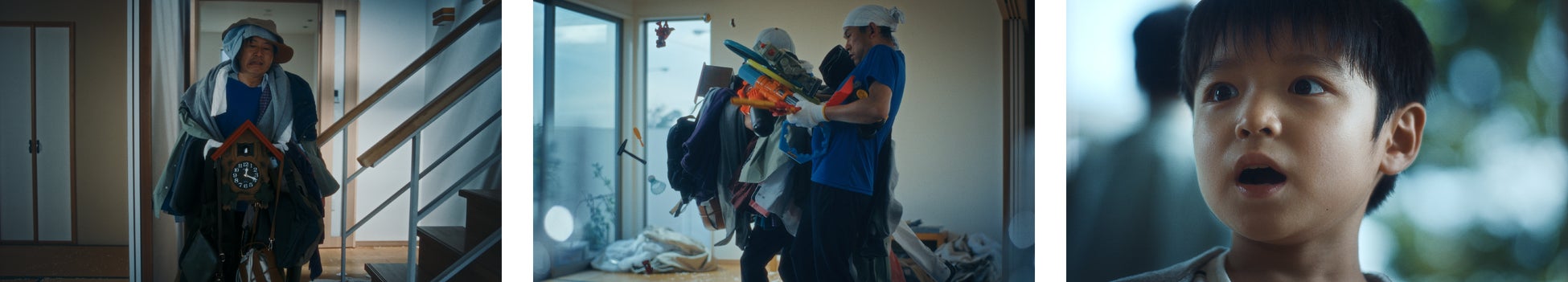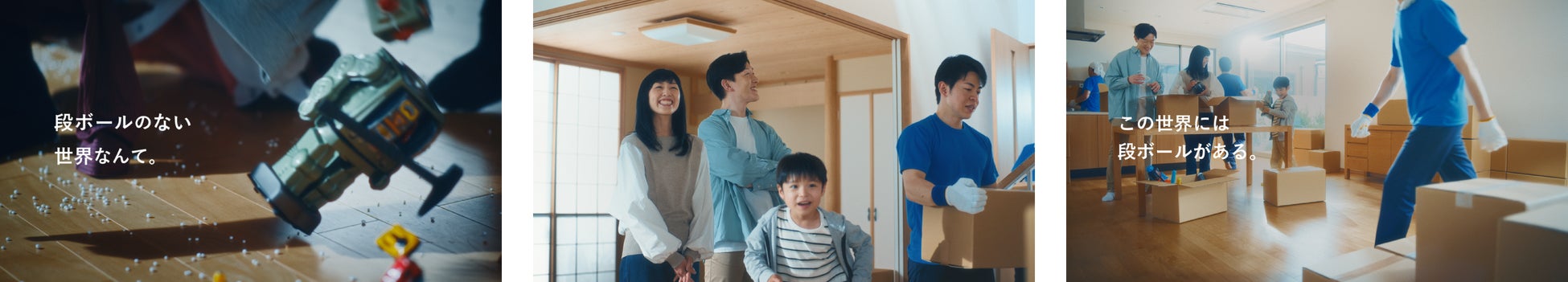 バラバラの洋服や鳩時計を手に持ち運び入れる疲れ顔の引越し作業員。そして、足元にあったおもちゃのボールにつまづき、おもちゃを持っていた他の作業員にぶつかってしまう。その様子を呆気に取られ眺める子ども。「段ボールのない世界なんて。」